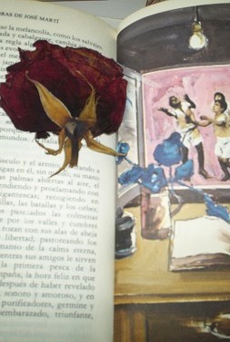 Volviendo a las intervenciones, las huellas del tiempo, podemos ver en este caso que no es de la biblioteca este ejemplar de El príncipe, quien lo leyó alguien que es parte de mis afectos, lo subrayó en aquellas páginas que más lo impactaron por las reflexiones de Nicolás Maquiavelo. Otro de José Martí, un libro muy preciado para mí, guarda una rosa en una de las hermosas ilustraciones. La rosa no es parte de un mensaje de amor, sino político. Tiene que ver además con uno de los poemas de Martí, aunque la rosa es roja y no blanca.